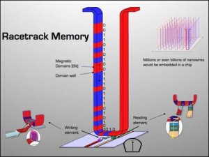 Память, как и у харддиска, - магнитная. Этим система немного напоминает видеокассету, только у видеокассеты носитель пленка, а у новой системы - проволока. Но на этом сходство заканчивается. Проволока в новой «трековой» памяти (racetrack memory) в миллион раз уже видеопленки, так что это уже нанопроволока. Способ записи и считывания информации совершенно иной - он основан на принципах «спинтроники» (область квантовой электроники, которая, как утверждают, скоро потеснит обычную электронику). В этой нанопроволочке биты информации передаются при помощи спинполяризованного тока со скоростью несколько сот метров в секунду. Четырехчасовую видеокассету можно было бы прочесть с такой скоростью меньше чем за минуту.
