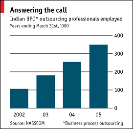 В отрасли аутсорсинговых бизнес процессов в целом, куда входит далеко не только работа телефонных операторов, по всей стране трудятся сейчас ни много ни мало 348 000 человек (см. график). Ежегодно из индийских университетов выходят по три миллиона англоговорящих выпускников. И в свое время этот факт поставил Индию вне конкуренции, и, собственно, развратил хозяев колл-центров.