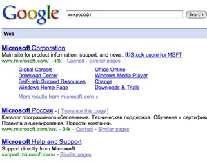 С другой стороны, ссылки на англоязычный сайт Microsoft можно получить как по запросу "микрософт", так и набрав в строке поиска "майкрософт". Причем, если по запросу "микрософт" российский сайт компании выводится на второй строке сразу после американского, то при запросе "майкрософт" сайта ООО "Майкрософт Рус" на первой странице результатов нет вообще.